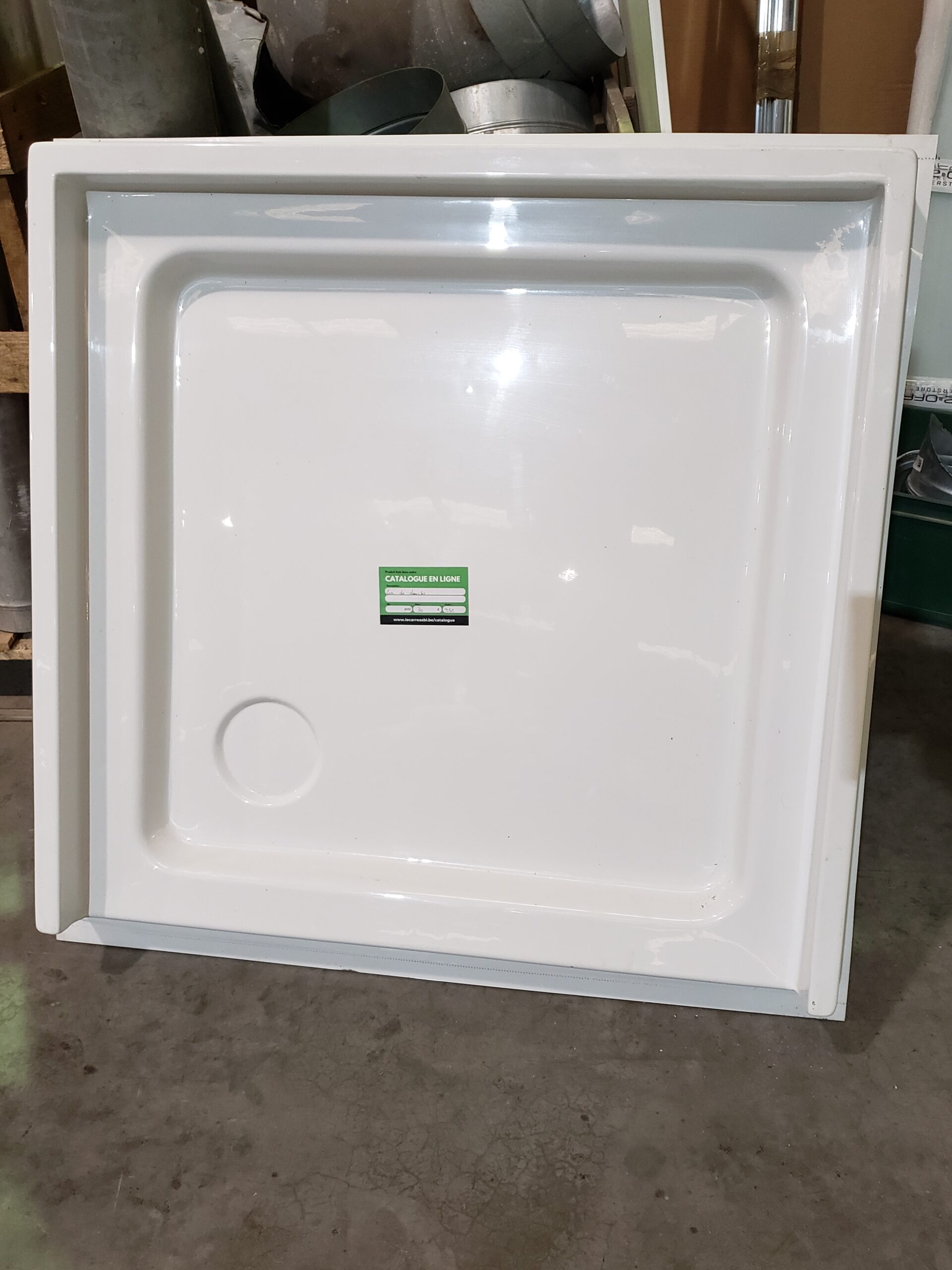 Description : Bac de douche. Dimensions : 91 cm × 91 cm. Disponible à la matériauthèque de Tournai.