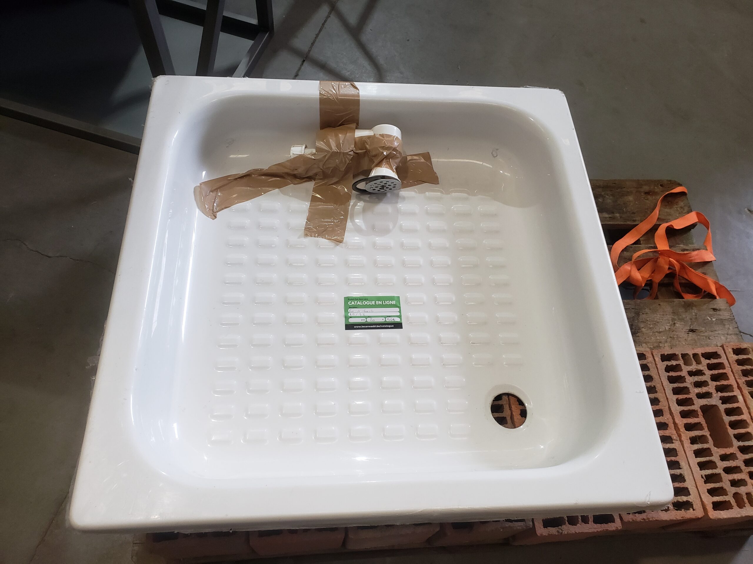 Description : Bac de douche. Dimensions : 78 cm × 78 cm. Disponible à la matériauthèque de Tournai.