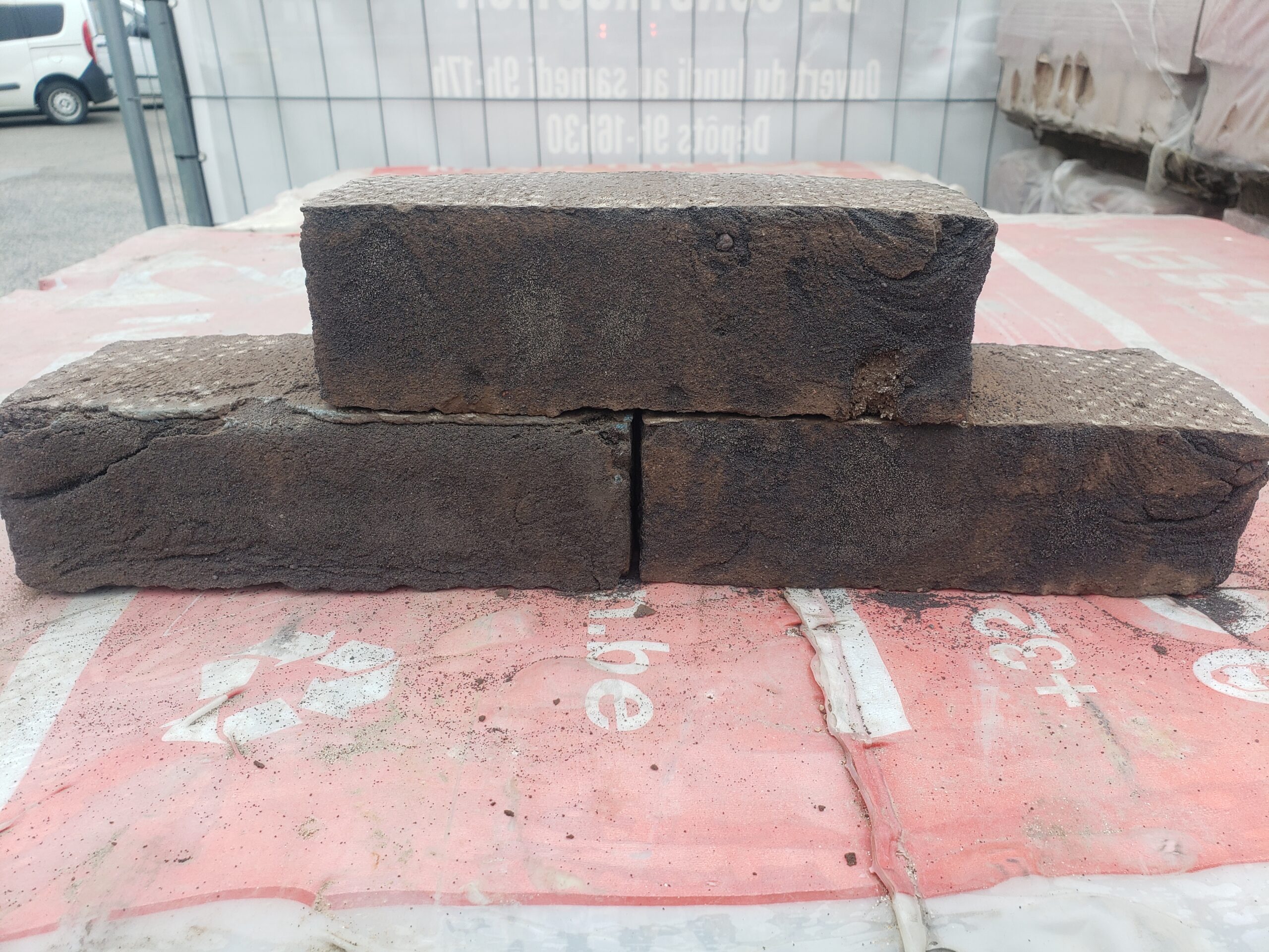 Description : Briques Nelissen Zwart Mangaan. Dimensions : 21,3 cm × 10,1 cm × 6,5 cm. Disponible à la matériauthèque de Tournai.