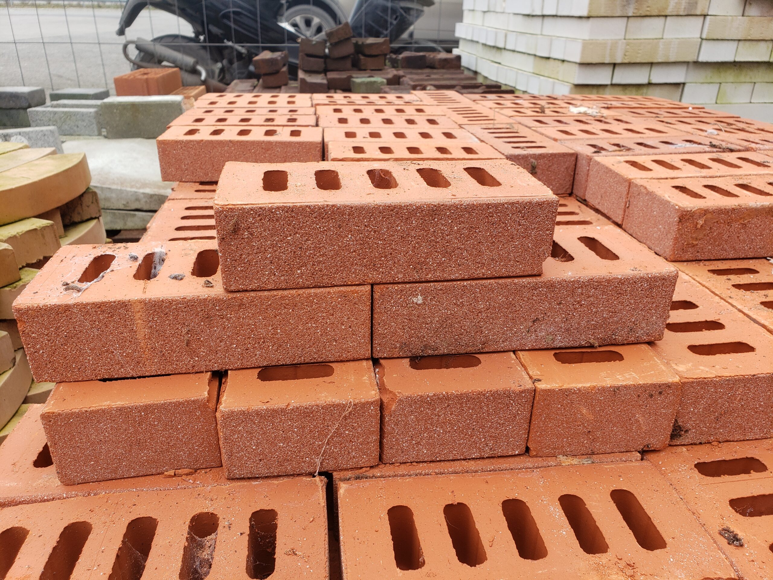 Description : Briques Wienerberger Terca perforée. Dimensions : 19 cm × 8,5 cm × 5 cm. Disponible à la matériauthèque de Tournai.
