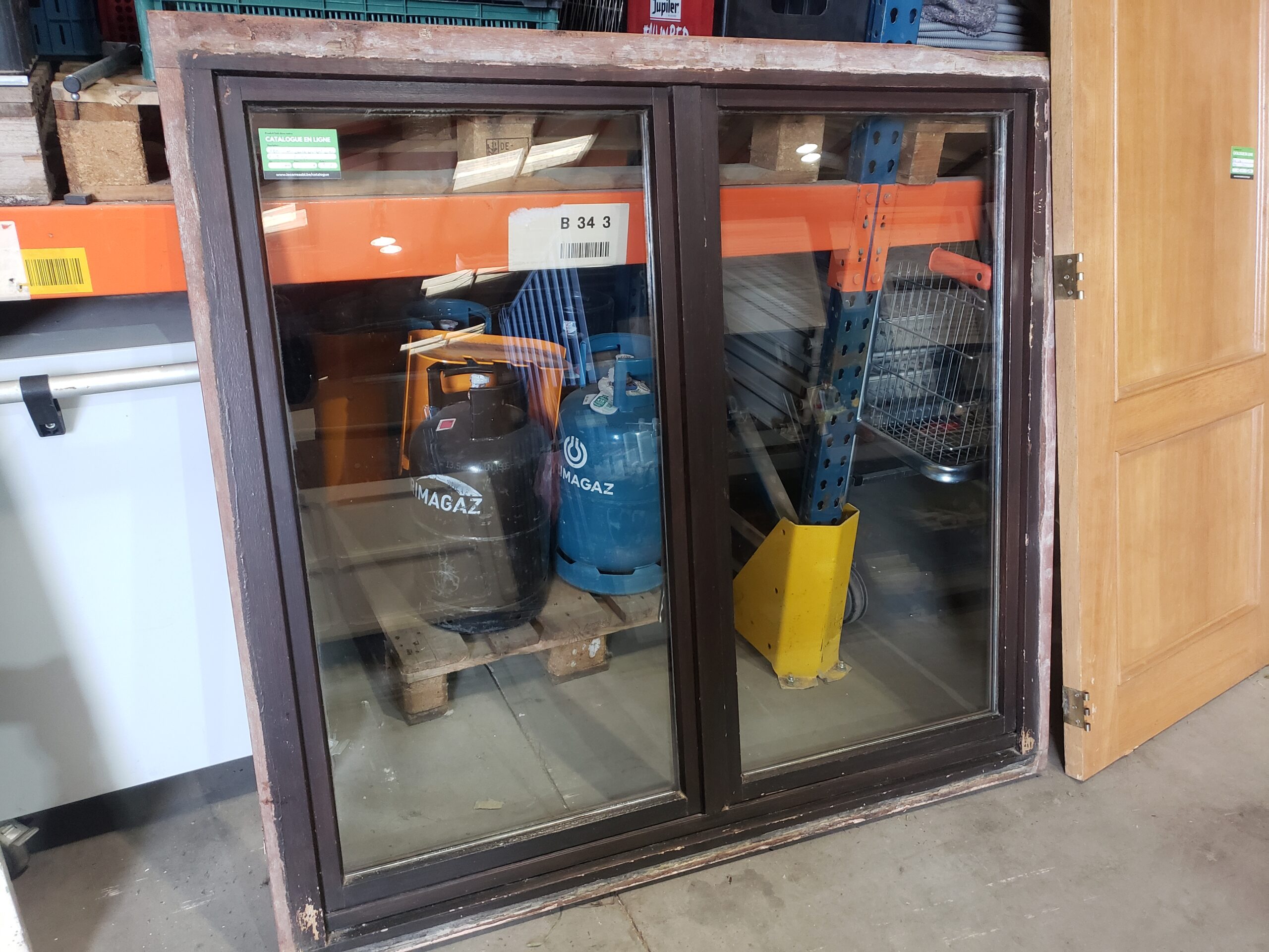 Description : Châssis en bois . Dimensions : 148 cm × 138 cm. double ouvrant / osci battant. Disponible à la matériauthèque de Tournai.