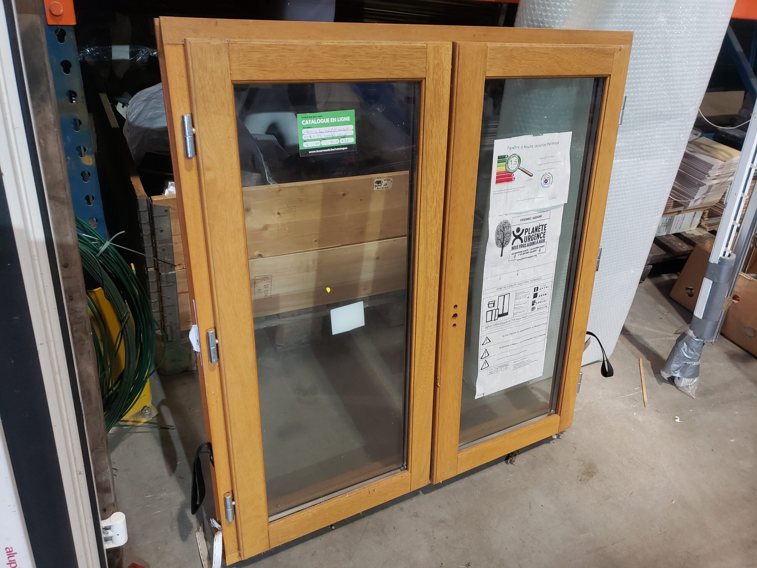 Description : Châssis en bois double ouvrant. Dimensions : 95 cm × 99 cm. double vitrage. Disponible à la matériauthèque de Tournai.