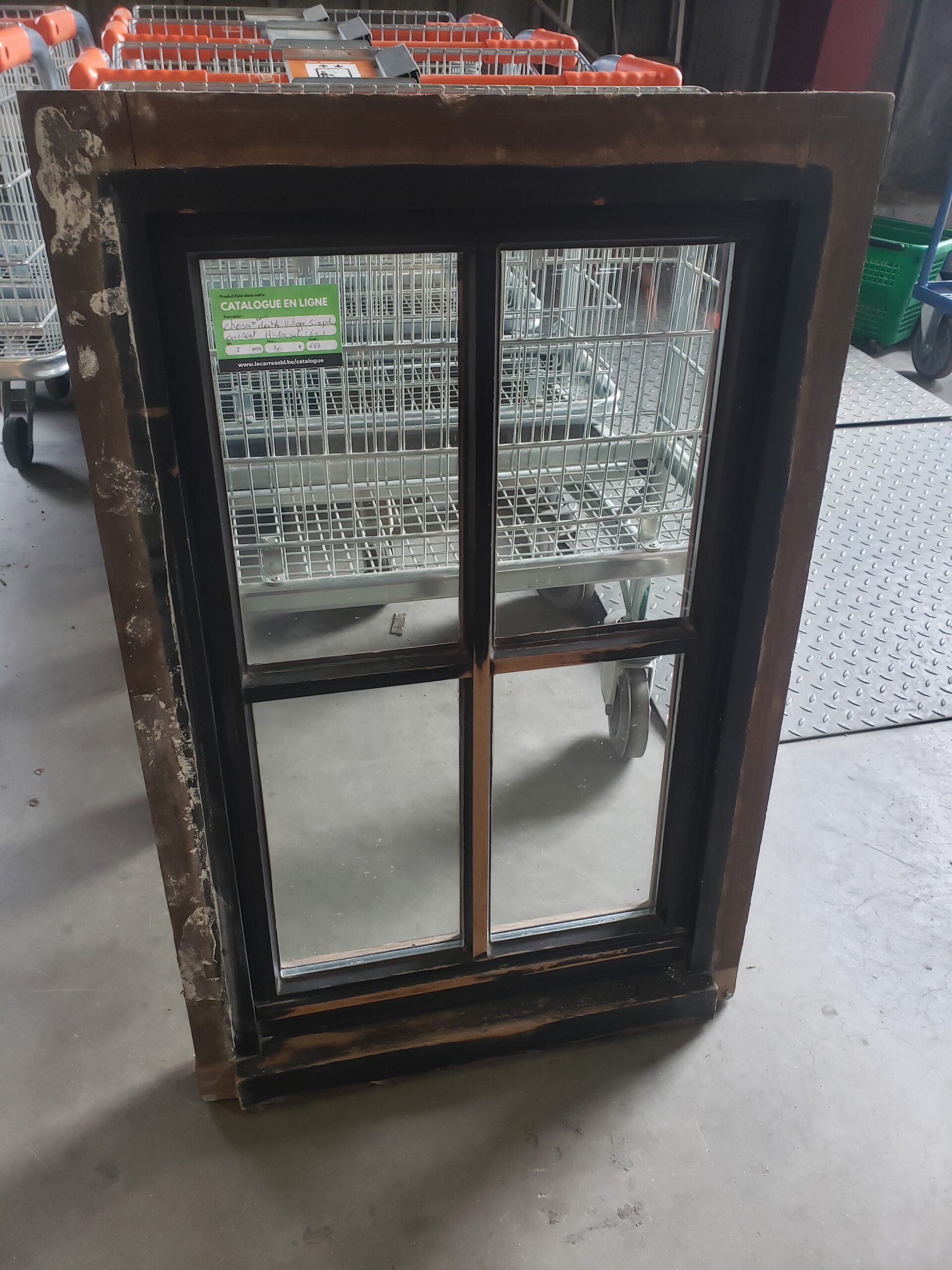 Description : Châssis en bois double vitrage simple ouvrant. Dimensions : 65,5 cm × 100,5 cm. Disponible à la matériauthèque de Tournai.