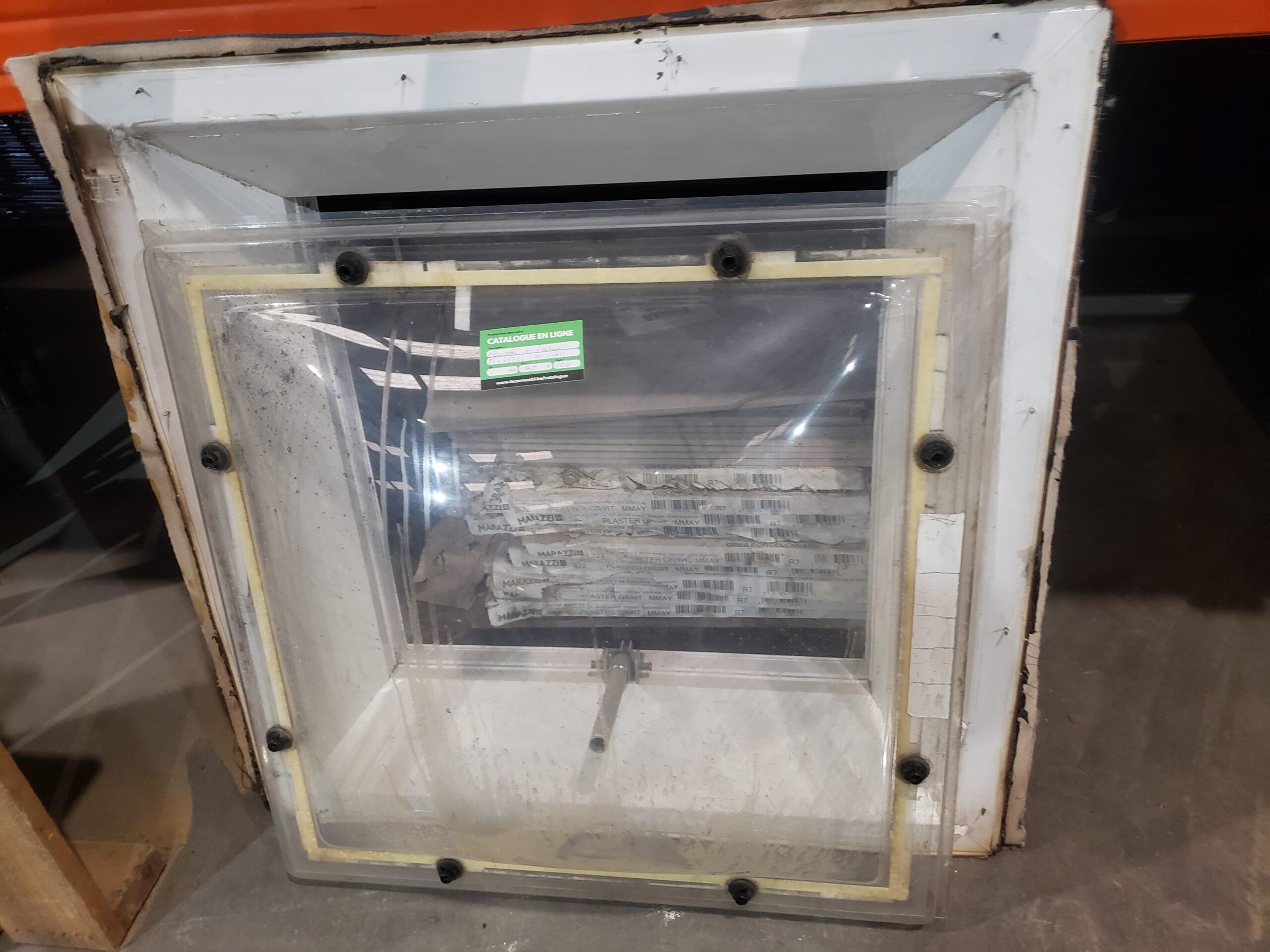 Description : Coupole avec embase. Dimensions : 101 cm × 101 cm. Dimension de la coupole 87,5x87,5 cm. Disponible à la matériauthèque de Tournai.