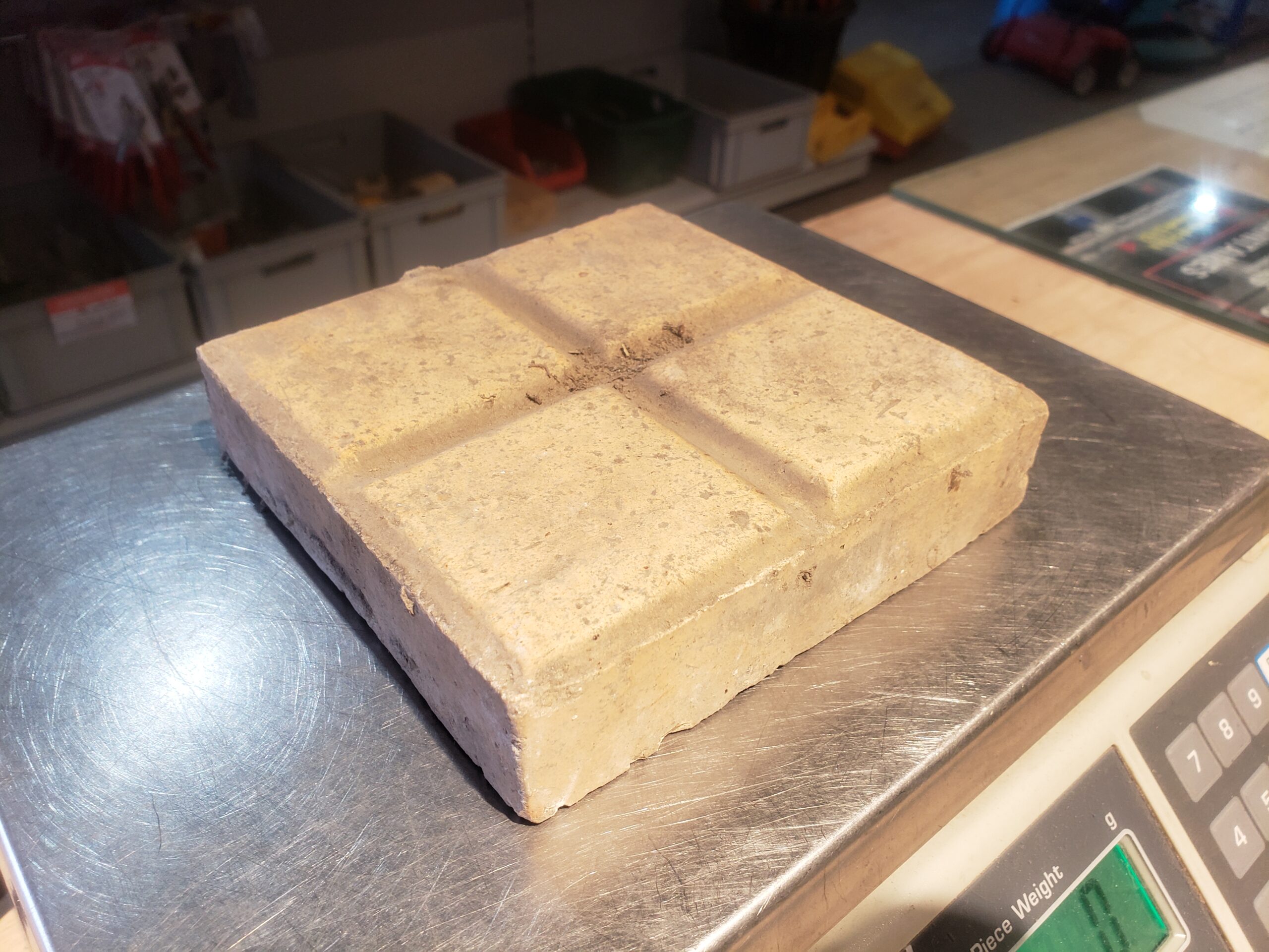 Description : Pavés quadrillés sable. Dimensions : 14 cm × 14 cm × 3 cm. Disponible à la matériauthèque de Tournai.