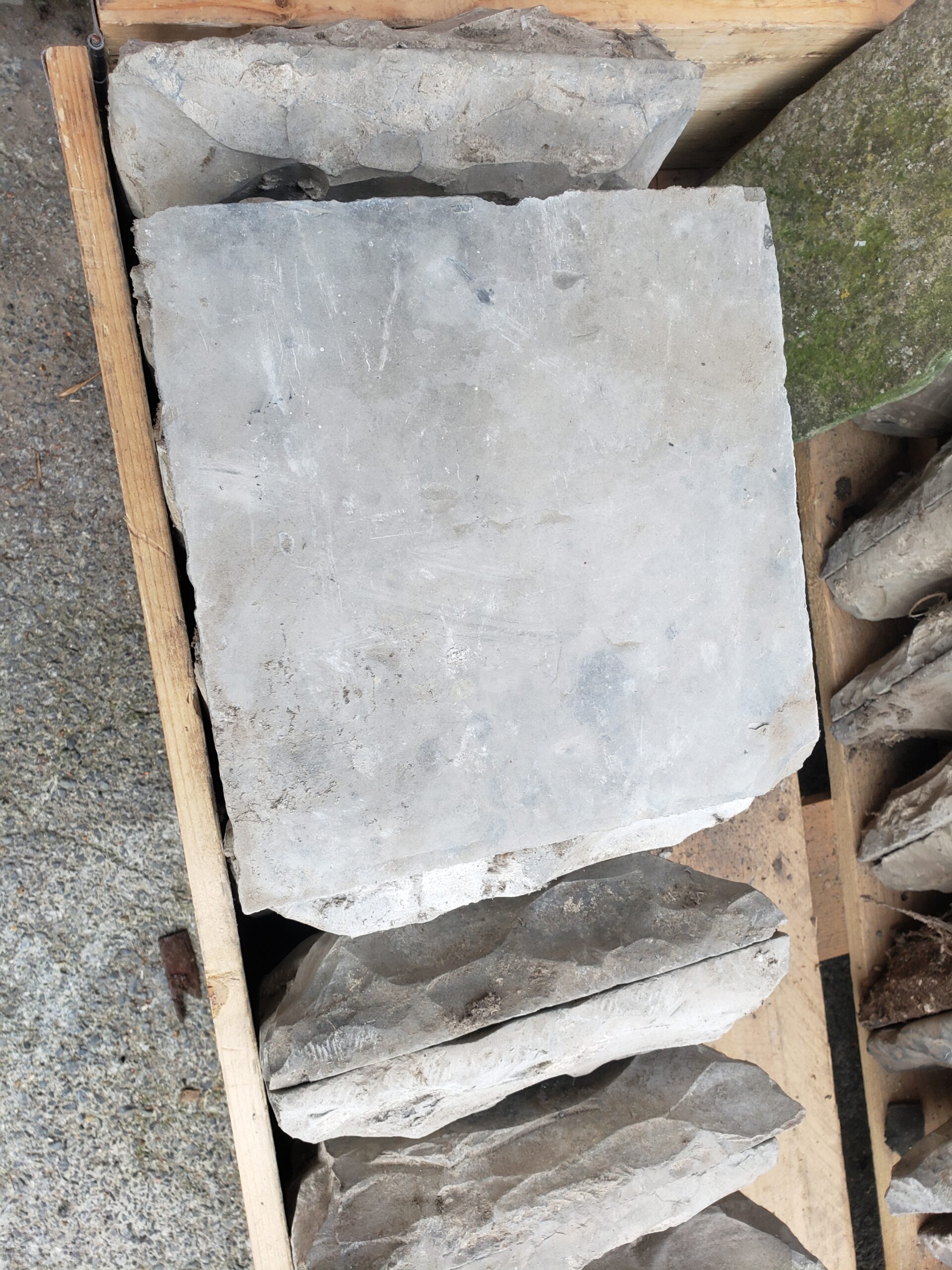 Description : Pierres bleues taillées à la main. Dimensions : 26 cm × 26 cm. Disponible à la matériauthèque de Tournai.