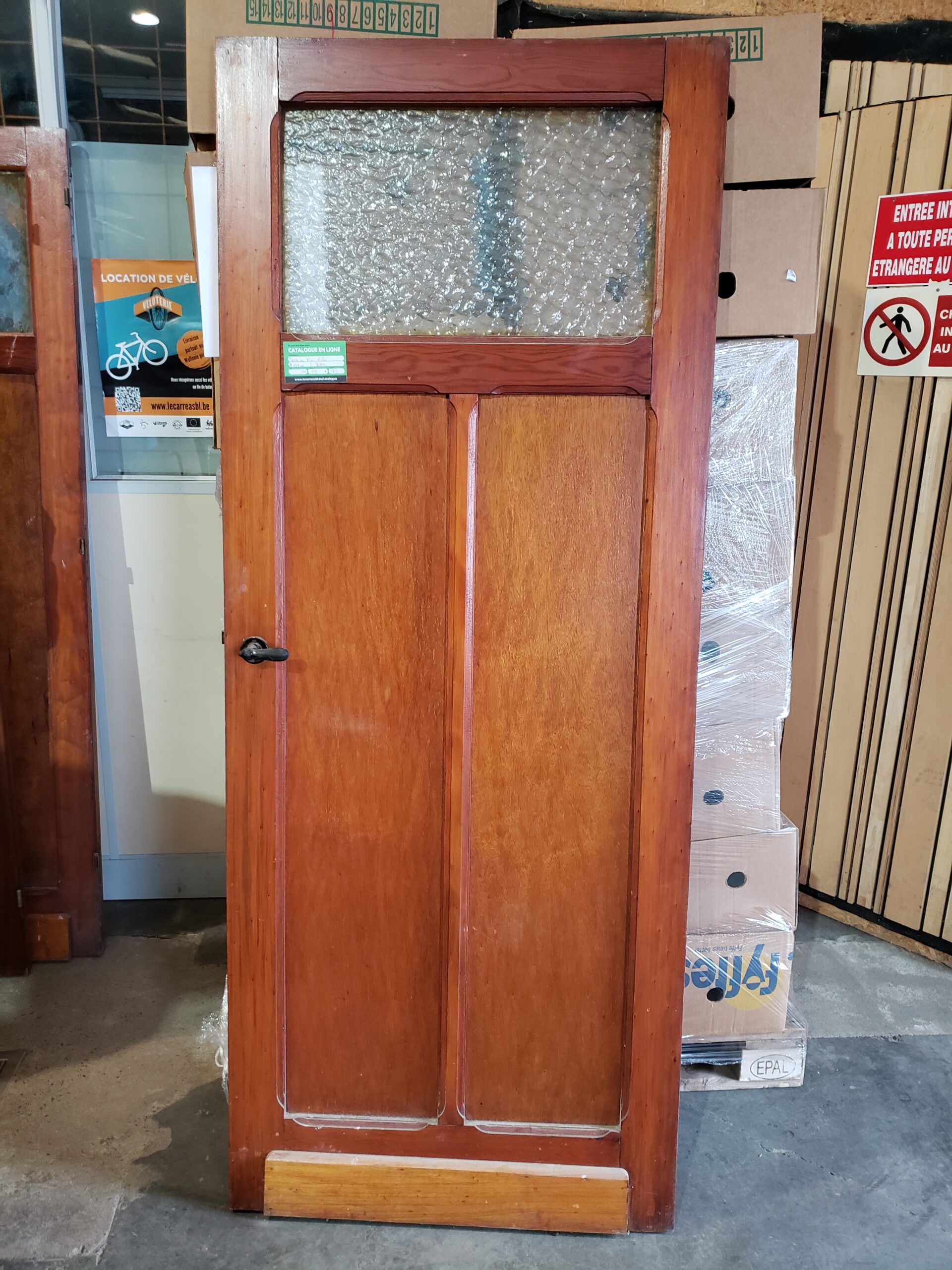 Description : Porte en pin vitrée. Dimensions : 80 cm × 199 cm. Disponible à la matériauthèque de Tournai.
