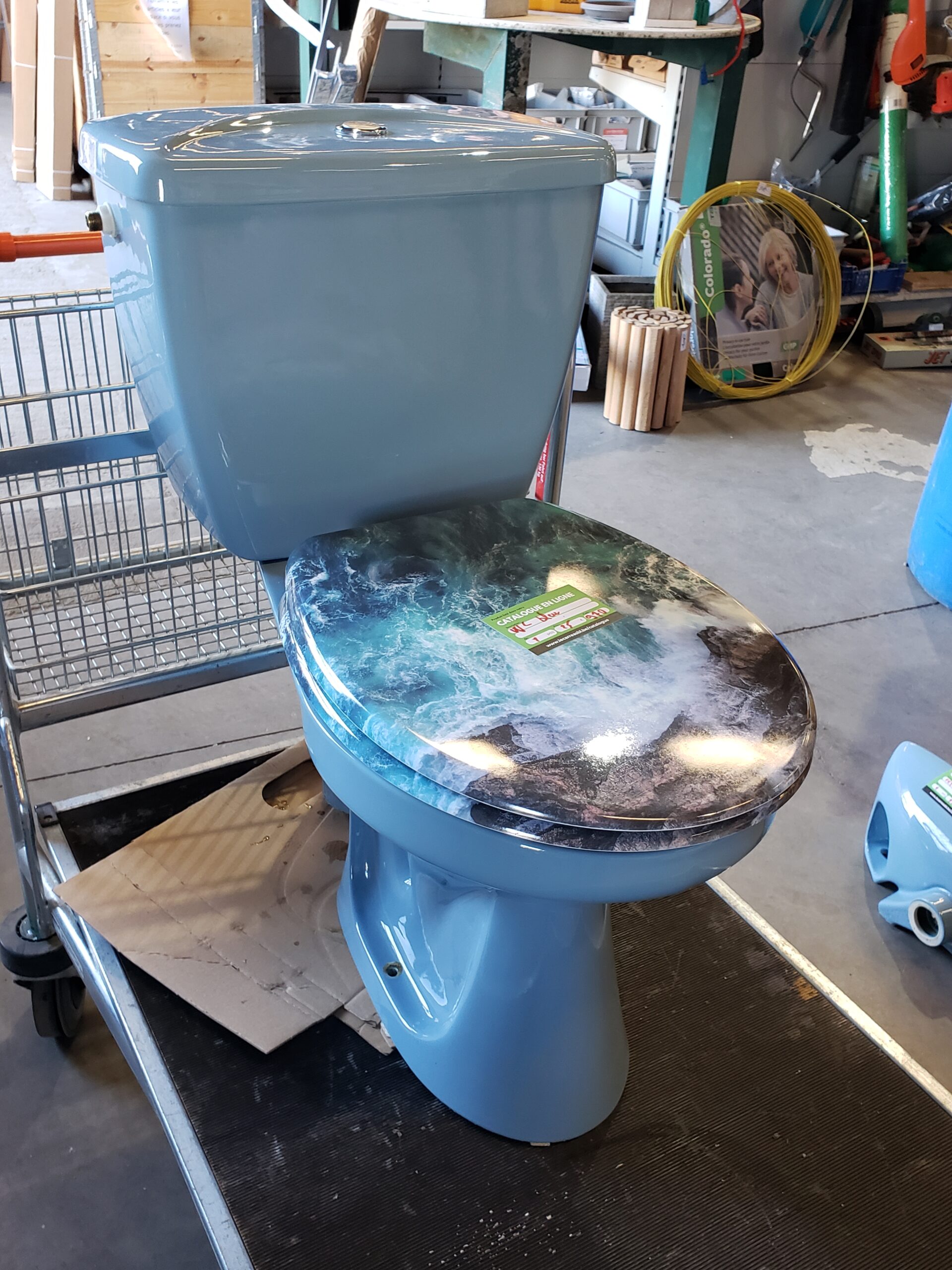 Description : WC complet bleu avec planche. Disponible à la matériauthèque de Tournai.